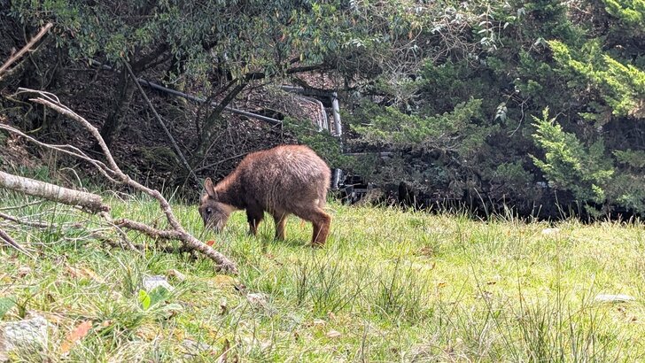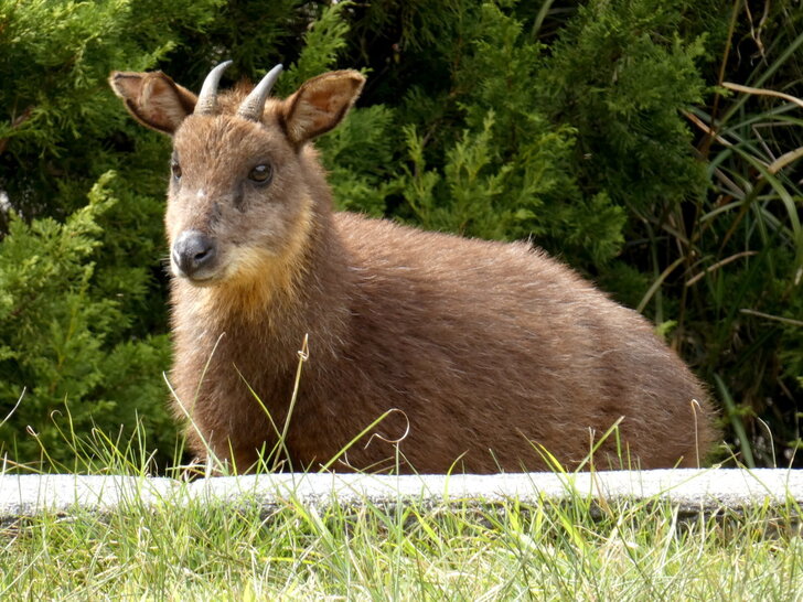 資訊站前小樹林一隻紅胸鶲沒拍好就被飛了,之後幾個鳥族人在廁所旁等候鳥兒出現,我本就不喜歡與他們湊熱鬧,這時惠來星空艙那一面傳來鳥聲,就往那一面的廁所走去,靠近時鳥聲遠了,卻見草坡上好像有隻山羌,仔細一看,咦!不對,應該是長鬃山羊(台灣野山羊)喔.↓