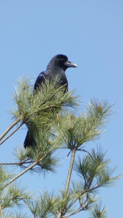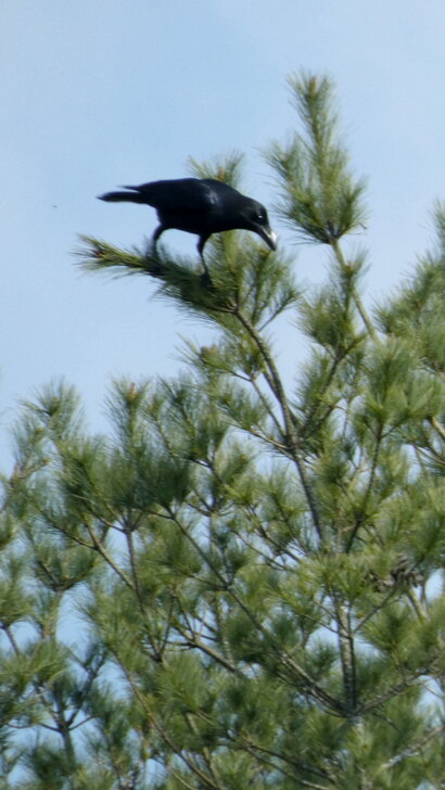 這時傳來嘹亮的嘎嘎聲,放眼過去,一隻巨嘴鴉停在遠處的高樹上.↓