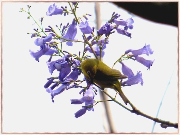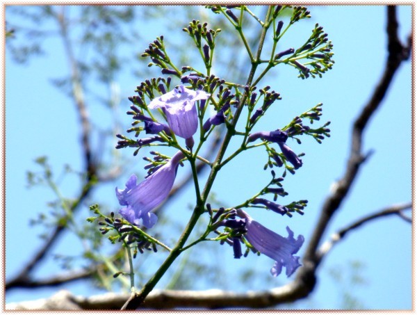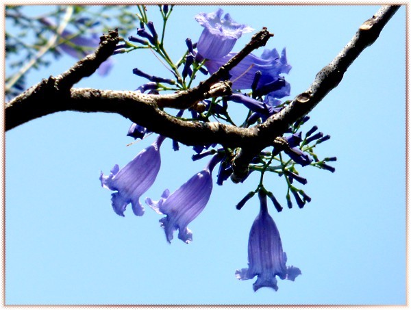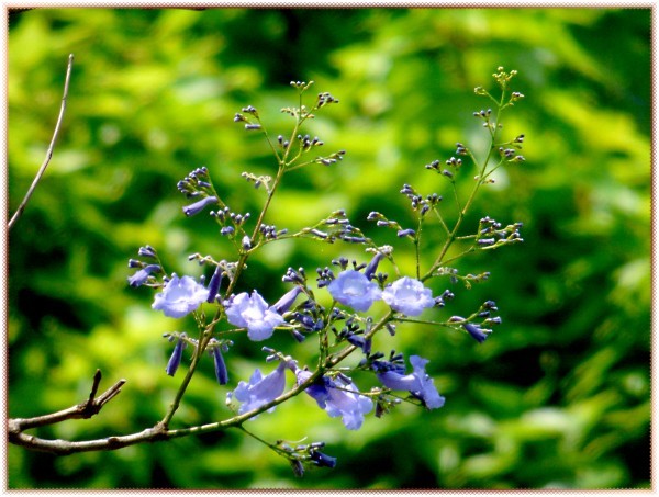 臺南虎山國小旁的馬路上種了一整排藍花楹,有幾棵整株都是藍紫色,沒有一片綠色葉子。至於其他綠油油者,不知是已開過還是未開。