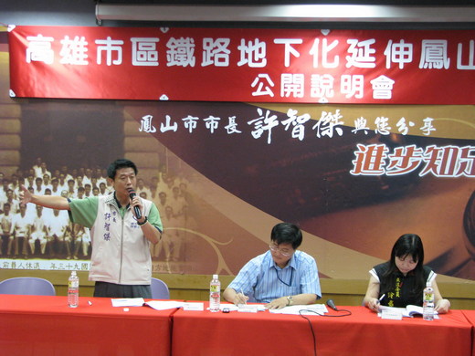 圖說:鳳山市長許智傑(左)要求鐵路地下化延伸鳳山工程,能準時在民國106年完工,交通部鐵改局組長王武俊(中)正埋首記下意見。記者林保光/攝影
