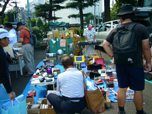 東京的跳蚤市場多在公園廣場 寺廟旁 場所大的話 賣主可將車駛入 直接將商品 搬出 展示 喜歡逛跳蚤市場 大約是被那鮮活的氣氛 尋寶於舊舊地 不能歸類的物品中 特別是一些停止生產 絕版的 或引人懷念的 真是廢棄物 或 寶物 各憑己見