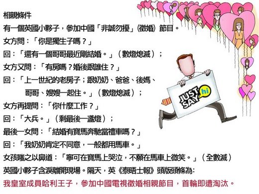 我皇室成員哈利王子,參加中國電視徵婚相親節目,首輪即遭淘汰。See More