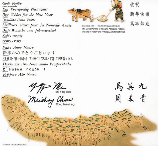 [橫躺的台灣成為今年總統府新春賀卡的重要設計圖樣.與前顧人怨的杜正勝使用橫躺台灣神似.引發藍營..綠營..兩邊立委強烈不滿。]