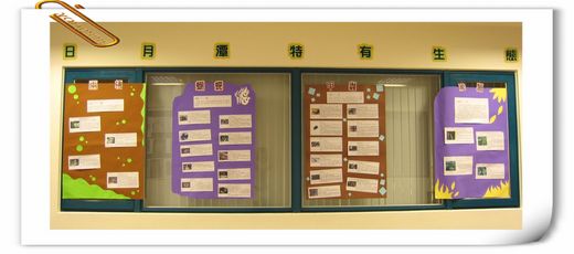 3、日月潭特有生態展:如蕨類、兩棲類、甲蟲類、鳥類等圖文並茂的解說。