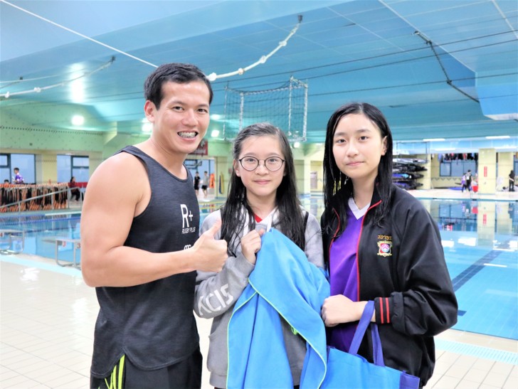 7年級的陳宥瑜和陳昀希之前就讀的學校並沒有游泳分級訓練,入學之前不諳水性,昀希甚至有點怕水,宥瑜雖有潛水經驗,但是沒有真正的接觸過游泳訓練,二人在陳君威老師的示範指導下,入學後漸漸開始享受游泳的樂趣,跟他們提到游泳課時,二人在泳池畔綻放開懷的笑臉,自信地說,相約8年級時能一起達標黑帽等級,也很期待9年級一同參加萬人橫渡日月潭的盛會!