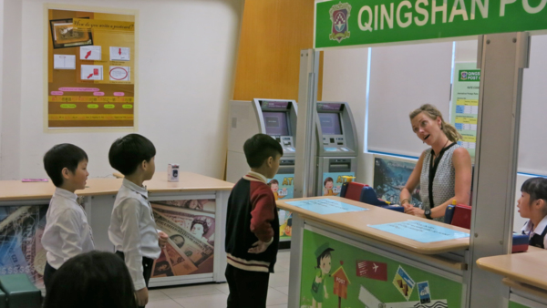 Welcome to Qingshan Post Office! 這是外籍英文老師 Ms.Lochner 熱情站在門口招呼孩子們的歡迎語。”Hello , I’d like to buy some stamps to mail this parcel to my friend.”“ Okay , please place it on the scale.”這一頭孩子呼應老師的對話,自然而然正與老師對話著。