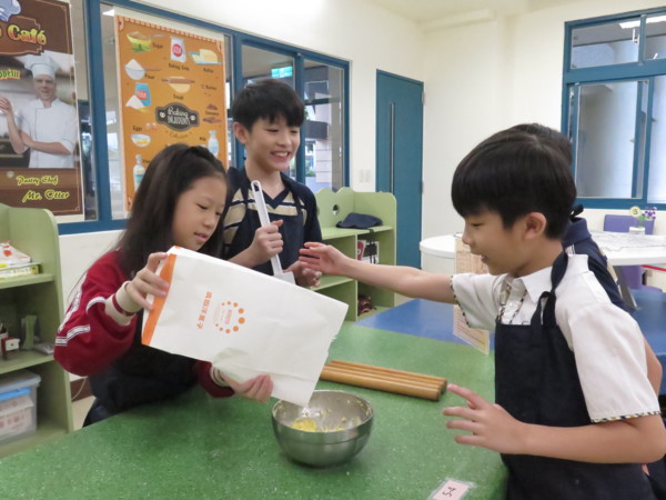 就如一堂讓孩子動手實做餅乾課程 (Making cookies),班上孩子紛紛化為烘培師、營養師和糕點師等,相互討論各自的獨家秘方,項目包含有營養成份、調劑份量…等,再加上最後的裝飾花樣製作出獨一無二的餅乾,每個人都學得不亦樂乎。儘管這些英文專有名詞在平日裡不常使用卻很實用,讓孩子們在這堂課裡不僅做出讓自己驚豔的餅乾成品外,在英文上也學的相當有成就感呢。