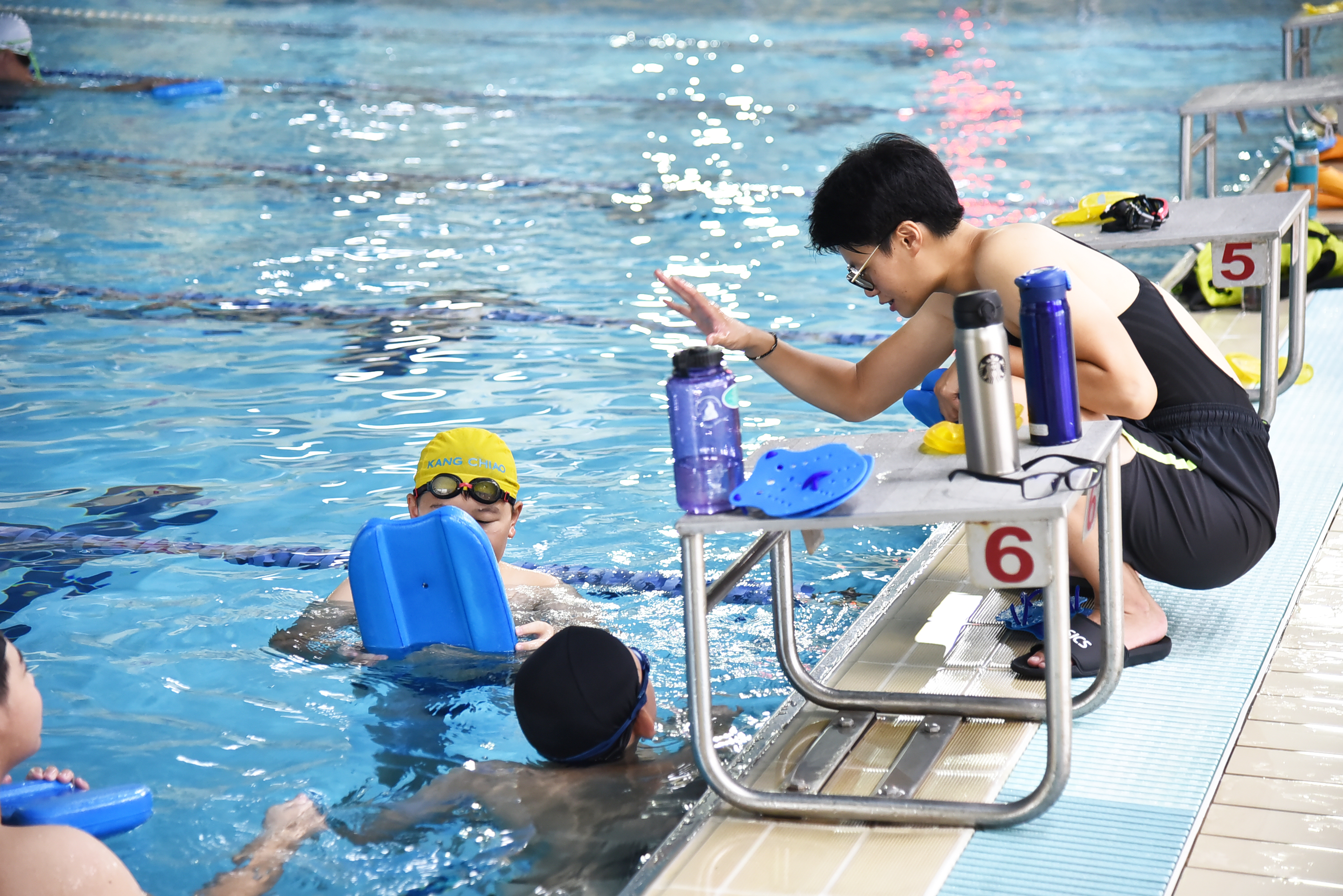 虎鯨老師的教學理念是讓孩子敢於「大膽嘗試」。比起學生因害怕做錯、怕被罵而抗拒學習,老師更鼓勵同學勇敢跨出第一步:「像學自由式換氣一定會喝到水,喝到就站起來咳嘛!咳完再繼續!」對品潔老師來說,在這個階段面對新事物,孩子犯錯是再正常不過的事了。如果真的有孩子排斥下水,老師也會私底下找學生談談,了解他今天發生了什麼事、為什麼不下水?待孩子敞開心房後,老師再用輕鬆的方式讓學生知道水下教學其實很彈性,同學可以先練習水中跑步、適應水性,鼓勵他們不要害怕、排斥。