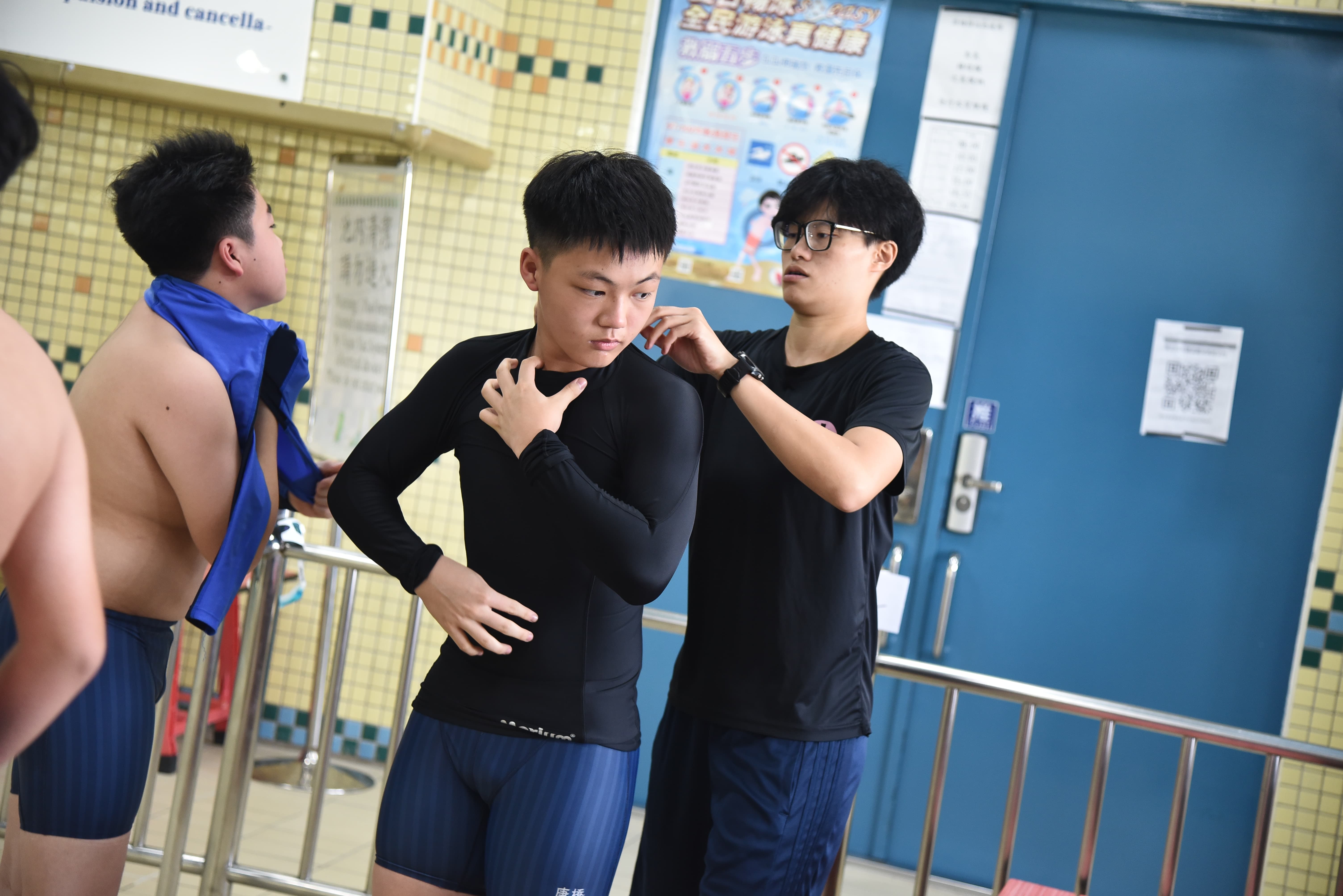 七八年級國中階段,康橋的游泳課程以掌握四式的游法與調整姿勢為主,另外加上自救課程與仰泳的使用,為九年級的泳渡日月潭菁英活動預熱。學校老師針對抬頭蛙、抬頭捷、踩水,到使用魚雷浮標、著衣游泳及水中抽筋自解等戶外水域的技巧和自救知識,皆給予非常紮實的教導。到高中後,課程加入趣味遊戲如擺盪繩、大浮板,以及水球的傳球跑位與戰術運用。游泳老師也會教到海洋與生態、環保知識,或是讓學生嘗試帶給同儕自我的游泳觀念與動作指導,老師再從旁協助。「既然你學游泳這麼多年,那讓你們討論、試試看!」品潔老師笑說,看高手如林的康橋泳士從什麼角度切入,再由老師協助總結,是教學相長,也是鼓勵孩子同儕共學、共好的一個方式。