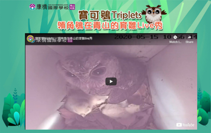 住在低海拔森林的領角鴞,今年初在青山校區田園區裡「成家立業」,住在2年前由青山孩子為牠們打造的第一代巢箱裡,甚至誕下三個可愛小寶貝,一起在巢箱生活了一段時間。那時田園老師幫忙架設24小時錄影觀測器,邀請孩子們能隨時隨地透過線上直播收看,呵護領角鴞寶寶的一舉一動,直至長大後飛出去闖蕩江湖。