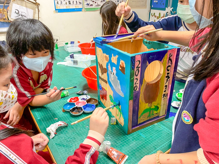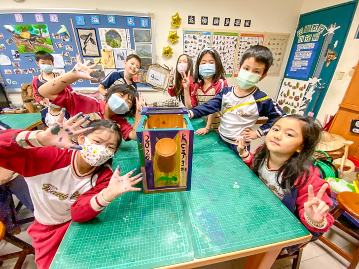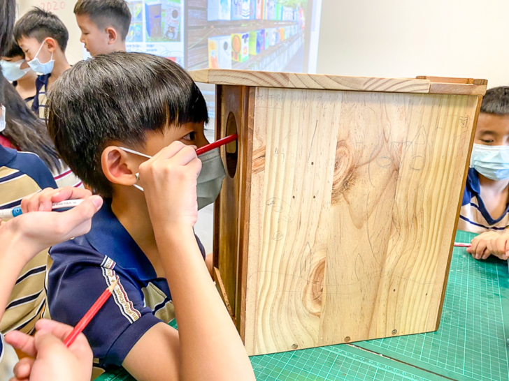 當第二代巢箱有了基本架構雛型之後,這時G6網界博覽會社團孩子邀請參加G3田園社團孩子接下繪製巢箱外觀設計的任務,G3孩子義不容辭馬上動筆來畫畫。有的畫上領角鴞愛吃的食物,如蟋蟀、蟲蟲等;有的寫上製作這一年的日期,巢箱被孩子畫上五顏六色、色彩繽紛的模樣,熱鬧滾滾,大致上這座全新繪製製作的巢箱就大功告成囉!