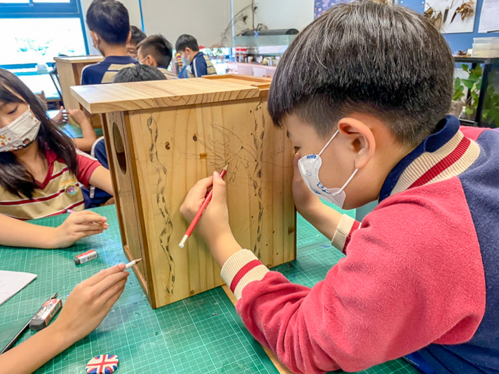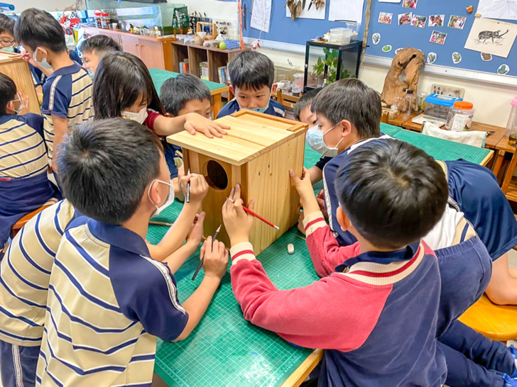 有了目標決心,今年網界博覽會社團的成員孩子,向田園老師提出改良巢箱計畫,當大家得知在第一代巢箱會因連夜大雨導致裡面也跟著淹大水時,大家在第二代巢箱裡的四個角落特別挖出小洞,增設巢箱的排水系統,讓裡面保持乾燥舒適;此外大家還將內部空間調整到最舒適的狀態,期待領角鴞寶寶的誕生,大家一起住在大房子裡舒舒服服。