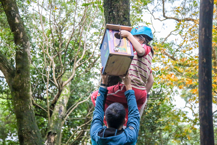 最後一步,孩子們再挑選一個天氣晴朗的好日子,由G6孩子一起將新製作完成的巢箱合力掛置田園區樹上,孩子們不分年齡共同合作,讓每位孩子都能為我們的田園區、大自然盡一份心力,跨齡分組學習的成果展現,讓孩子們緊繫著共同遠景目標,一起期盼著春天來臨,領角鴞一家子能再來青山校區舒服地作客。