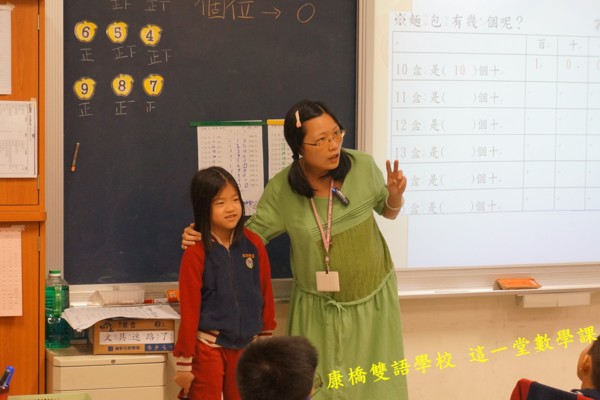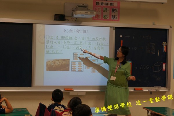 在課堂上,透過全班共作模式,讓孩子以一個白色積木代表一個麵包、一個橘色積木代表十個麵包,透過具體操作進而熟練10個一可以變成1個十,10個時可以變成1個百的化聚概念,再透過資訊融入的方式,利用互動式電子白板,全班一起完成數數,更加深學習印象。