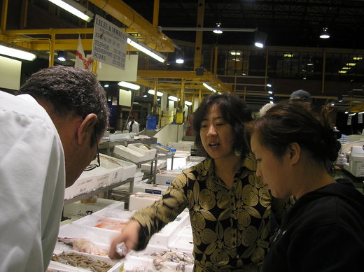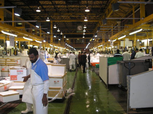 這個海鮮市場佔地13英畝,里面的設備都由一樓的專業人士管理,魚的來源,品質的控制,衛生的處里,健康與安全的管理,非常的專業.每星期二至星期六,早上5點開到8點30分早上.這里的商人在5點早晨之前是不准收錢或接受定單,一定要拫据里面的大鐘響了5下大伙才正式營業.我今天 4 AM到了這里買了一箱鱸魚£14,一箱蝦£24,–箱SEA BREAM魚£25,30個 SALMON的魚頭£10.80, 8個SCOTLAND CRAB鉗£8.30.這里的商人破例收了錢,5AM才准我拿貨,這是這個海鮮市場的規定.