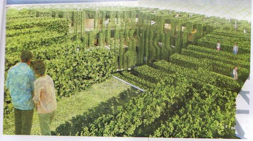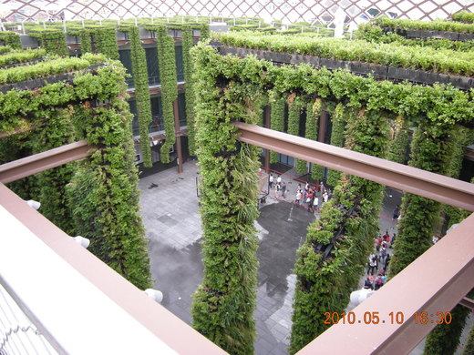 由20萬株綠意盎然的植物所組成的垂直花園,並非只是給法國館增添綠色而已,它同時也在展館屋頂和外牆上佈置,成為建築物的核心部分。花園並非必須要在地面上,或是傳統高樓的底層。無論是在露台上漫步於黄楊和芳香植物之間,還是身處於中庭的懸式花圃,觀眾都是被包圍在園林樹叢裡。法式園林的典型外觀則用鮮花點綴的花園而得以表現,依稀能看到凡爾賽宮花園的影子。景觀設計師的園林設計並未使用凡爾賽宮時代的阿拉伯式渦卷型圖式,而是再現電腦中印刷電路板的幾何形狀,這正是當代的造型特色。花圃巧妙的演繹,用垂直方向伸展,由展館頂樓露台又轉至中庭。
