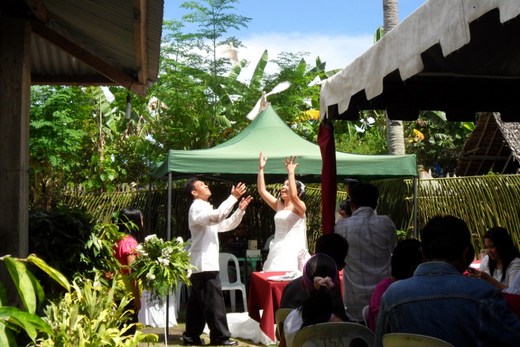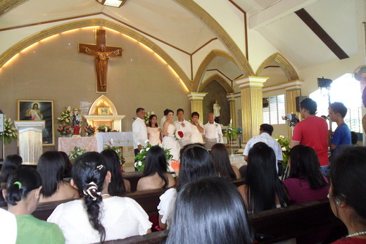來到這邊居然有機會參加到學校老師的結婚典禮,感覺真是榮幸,也體會到不同的結婚儀式。菲律賓人結婚大多都還是會選擇天主教的儀式,到教堂請神父舉辦婚禮,儀式其實很簡單,並沒有甚麼複雜的習俗或手續,在教堂裡大家都會為新人祝福,教堂儀式結束完了之後,就會到新郎家參加宴客,會在新郎家的院子擺自助餐式的宴客,然後還會有新人放鴿子、拋捧花的活動,其實很熱鬧。