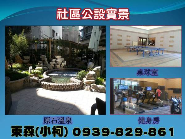 公共設施:林園步道.原石溫泉.瀑布泳池.風雅大廳.檜木溫泉.韻律世界.健身世界.乒乓球室.兒童遊戲室.運動天地.KTV.