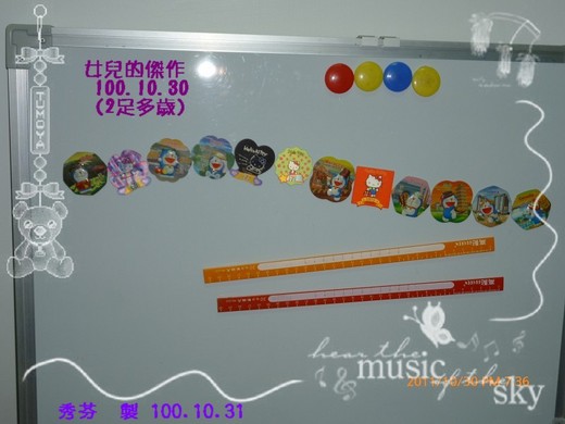 晚上因我與老公分工合作家事,女兒就一個人在客廳玩,等我忙完事情後,瞥見角落的白板上有一幕…這是女兒的傑作耶!!