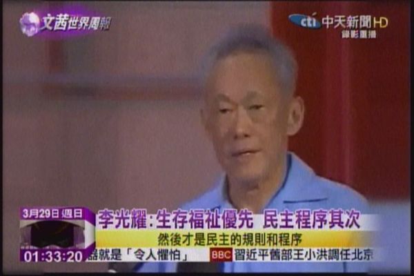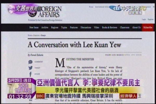 「我們允許美國記者來報導新加坡,把我們介紹出去。我們也允許美國報紙在新加坡賣,因為我們要瞭解外國人怎麼看我們。但我們不能允許他們像在美國一樣,監督政府,反對政府,調查政府!」