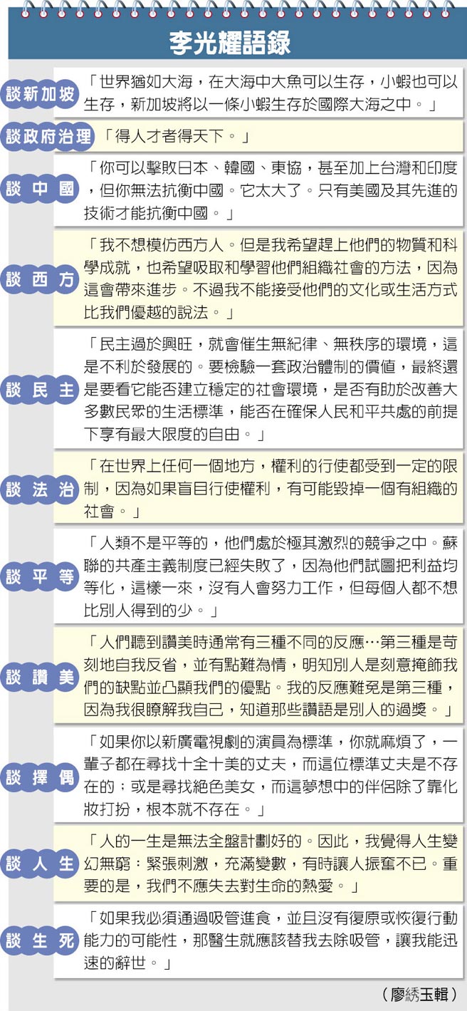 新加坡建國總理李光耀以「大家長式」強硬作風嚴厲治國,曾說過不少惹來爭議的政見名言。