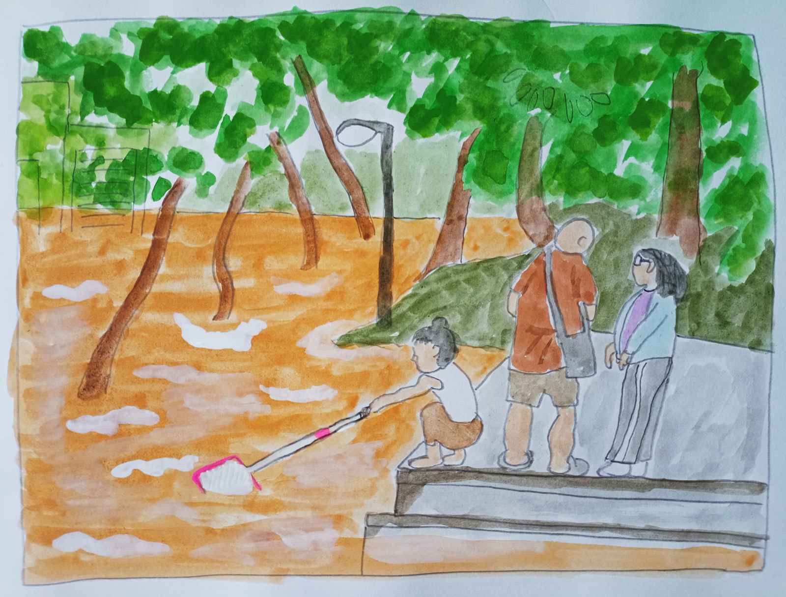 ⬆ 風災中苦中作樂的居民。(雄獅不透明水彩+計算紙)