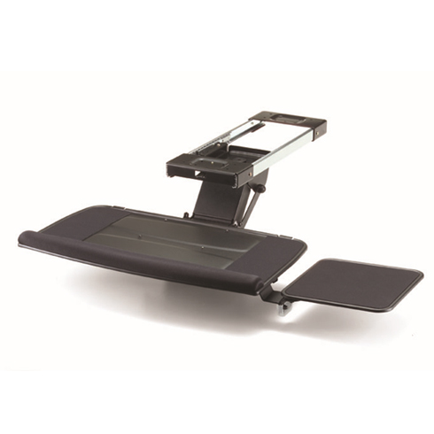 必須裝木質桌底面上,先把滑板鎖螺絲固定於桌底,再將鍵盤組件滑入滑板槽內,鎖入兩端止檔螺絲讓鍵盤不會滑出滑板,最後再將U型桿穿過鍵盤底部,將滑鼠盤鎖在U型桿,然後將滑鼠板轉正。(注意,滑鼠板要鎖上U型桿之後才轉得動,未安裝時是沒法轉動的)