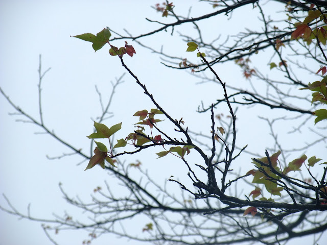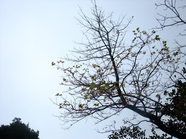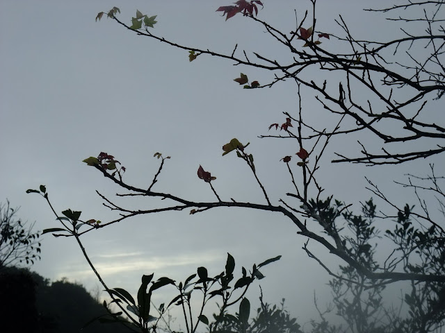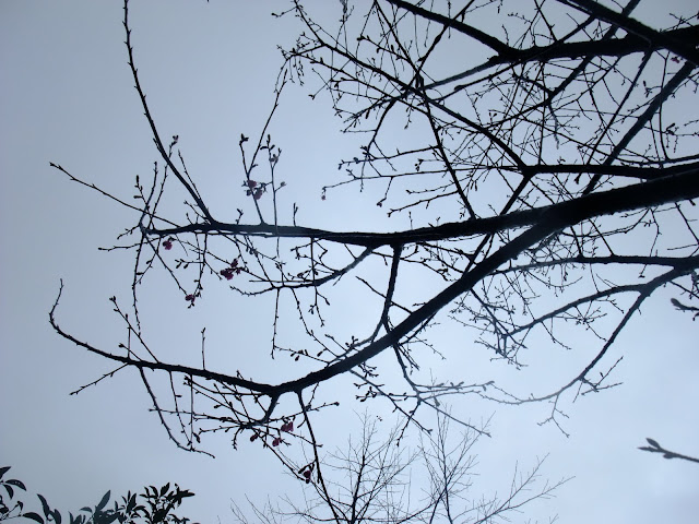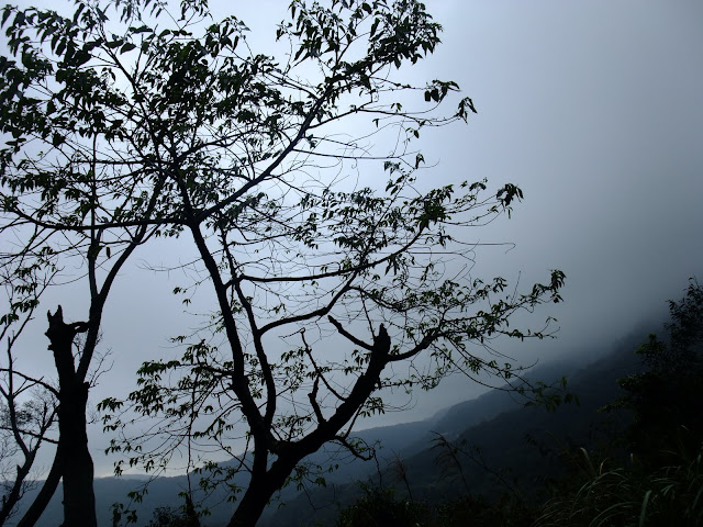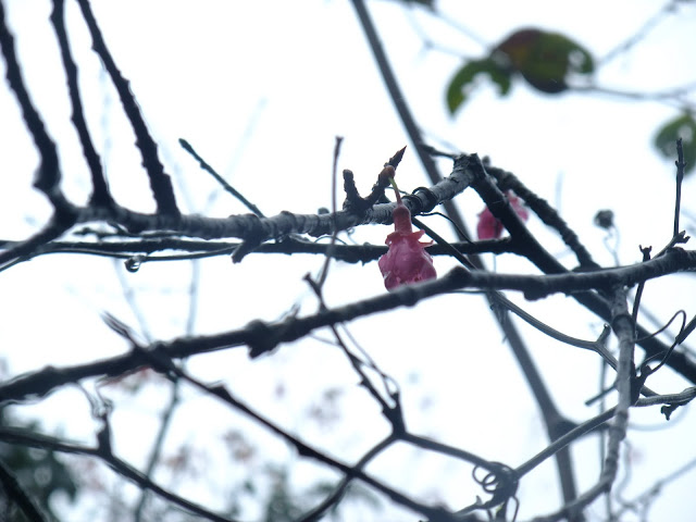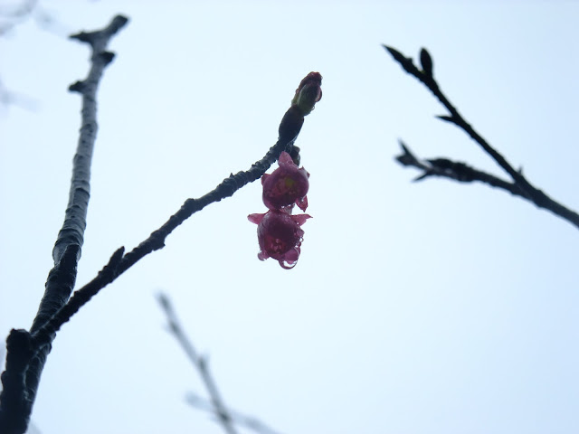 霧濛濛的天空,山櫻花在山上有幾棵櫻花樹已經開始綻放小花。海拔500公尺離風櫃嘴還有2公里的路上。