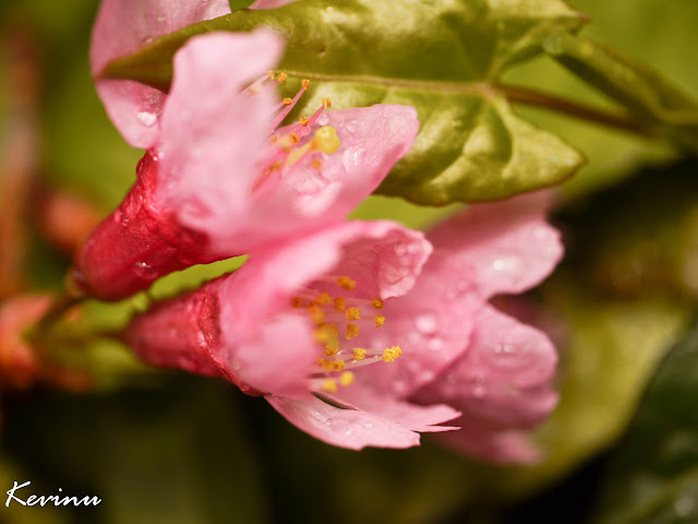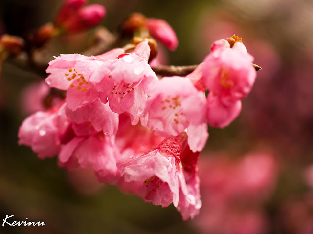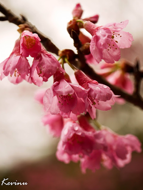 雨後的陽光閃耀著, 經滂沱大雨洗禮過的粉紅櫻更加耀眼。