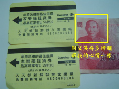 可是,要回去時,又發現一件Super嘔的事情。當時大約九點半左右,賣場的出口已經不收費了,只見一輛一輛車魚貫而出。莊孝維喔!(對不起,我是JC鮮師,也有受不了的時候!罵人的話字體弄淡一點)