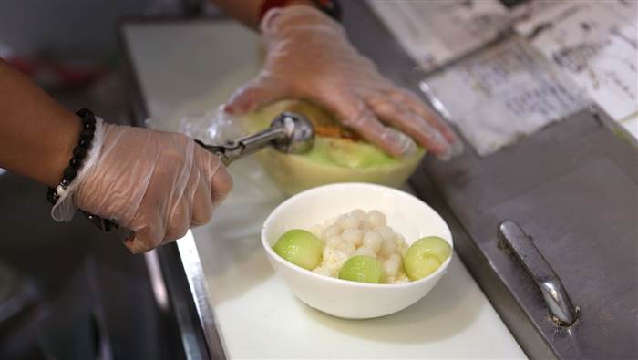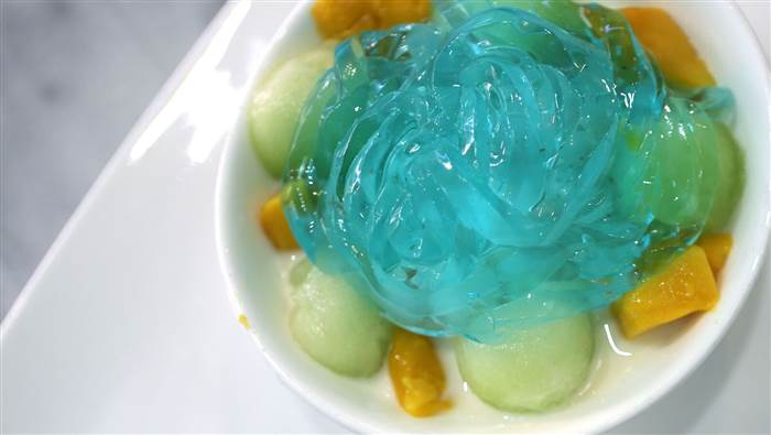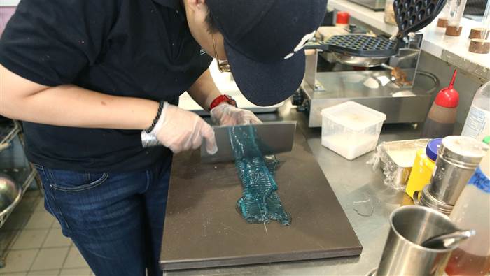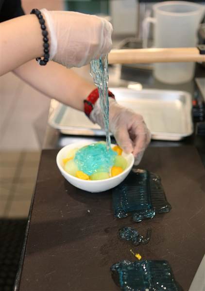 ▼其實他的麵條跟一般的拉麵不一樣,而是用日本傳統的涼粉製成,有點類似果凍的口感,在鋪在許多配料以及冰淇淋上面,就變成像是拉麵的造型,「冰淇淋拉麵」這個甜點就這樣誕生。
