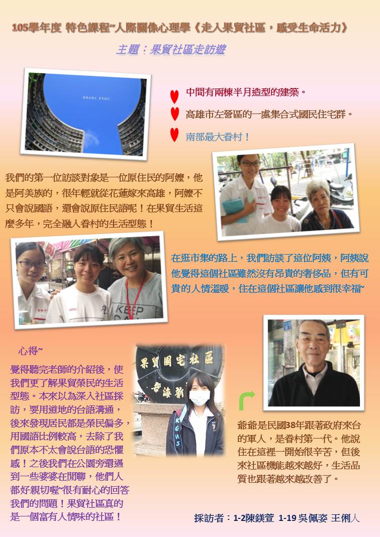 105學年度特色課程「人際關係心理學」《走入果貿社區,感受生命活力》主題:《那天,我們淋著小雨走進果貿…