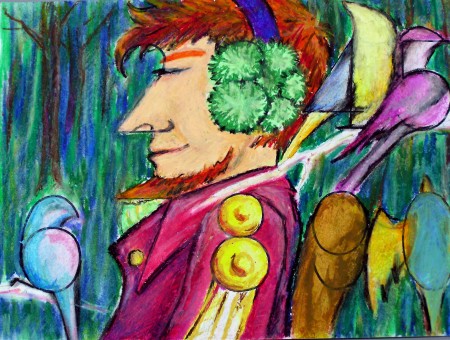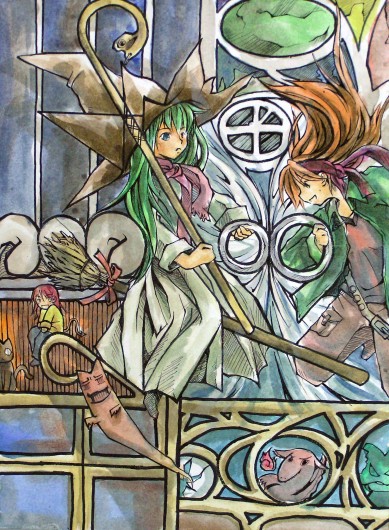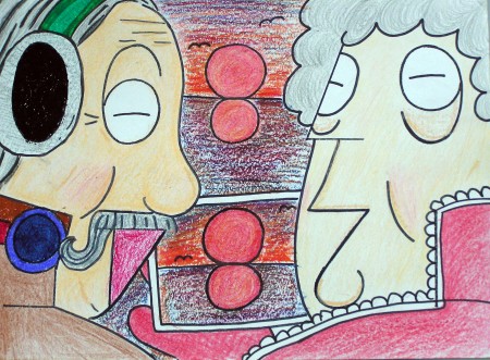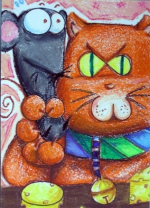 這是老鼠在偷吃食物時被貓抓到的那一瞬間。這個點子是我塗鴉無意中畫出來的,覺得效果還不錯,就用了。我想把這張圖畫成像圖畫書的插圖一樣。