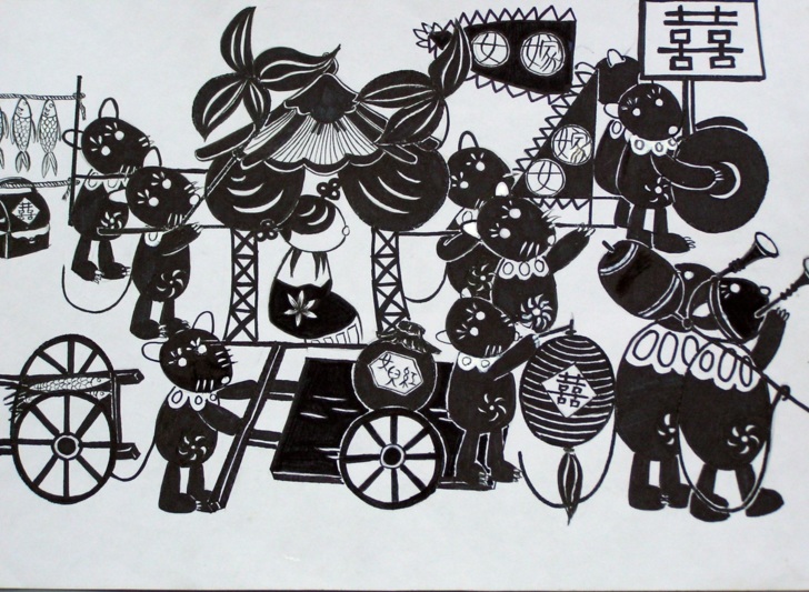 一直都很喜歡「老鼠嫁女兒」的故事,所以當我看到兩行數字時,兩行出嫁的隊伍便浮現在我眼前。因為有著原本粗黑的數字線條的限制,所以我瘸定全部以黑色著色,並利用這一點稍加改變,便有「剪紙」的風格。