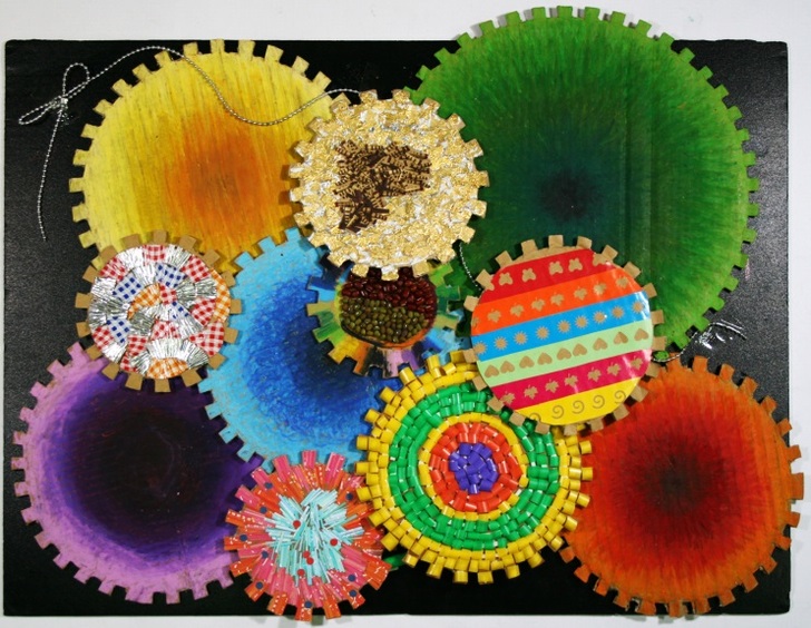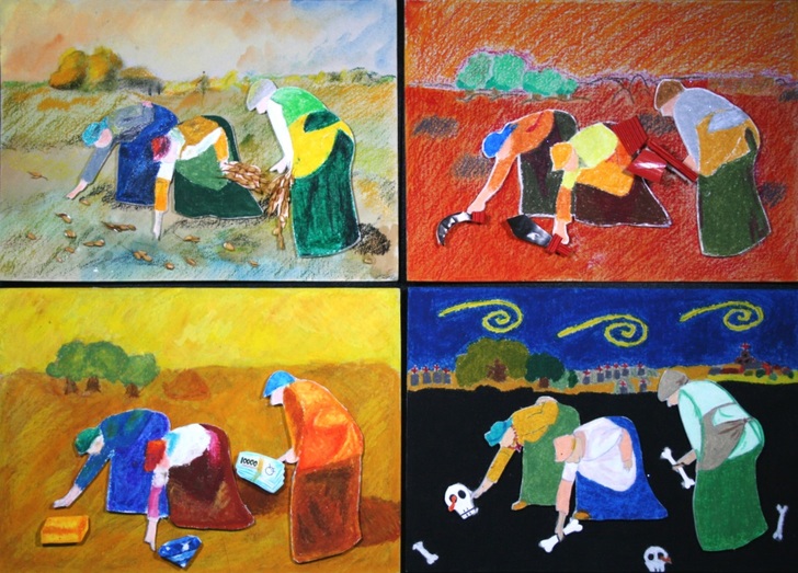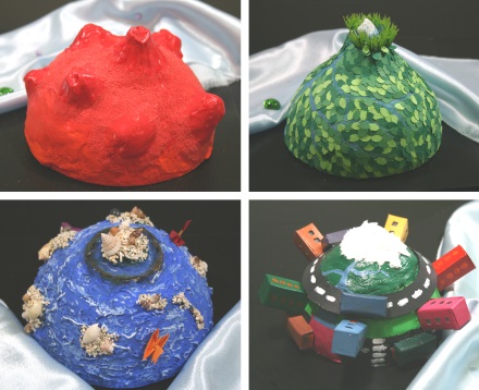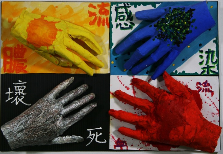 最後再以創作課程為引導,讓學生親自體驗色彩奇妙的變化。以「色彩四部曲」為創作主題,引導學生思考如何以不同色彩或色系表現。創作採分組方式(一組4~5人),各組進行腦力激盪,想出一個事件或情境,重點是構圖必須相同,最後再以不同的色彩表現出相異其趣的畫面。 為了讓學生體驗另一種美術上課方式,最後彙整學生作品舉辦「慧眼識英雄」美展活動。學生透過展覽可欣賞其他學生的作品,並學習如何欣賞與評斷畫作 。 |