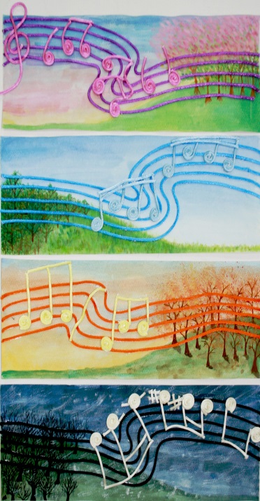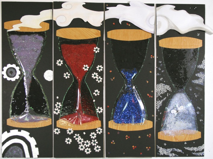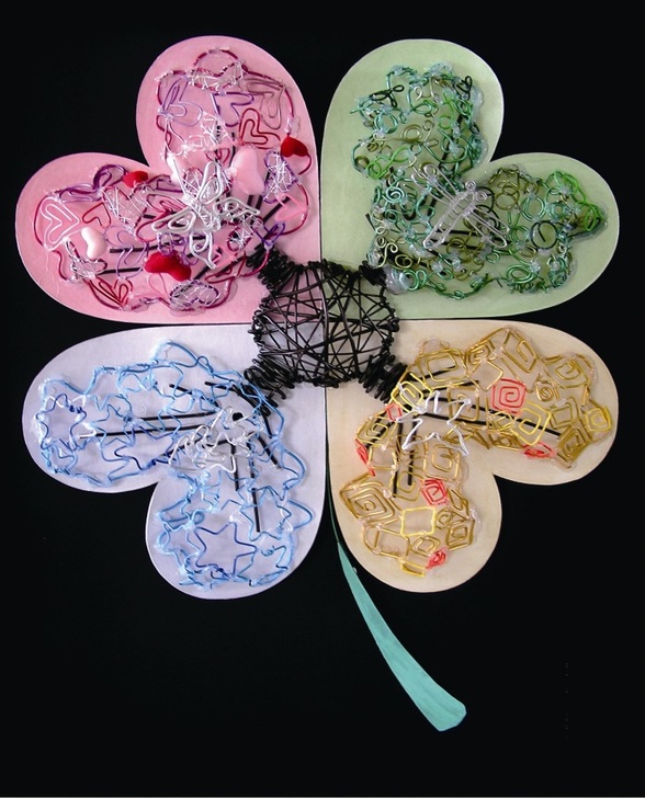 我們作品是由幸運草的四辦葉片,組成四個季節所展現出的顏色,所有的物件都是由鐵絲和鋁線組成,四季皆以不同的顏色和形狀來做代表,表現出青春期的我們,在四季所擁有的不同心情。