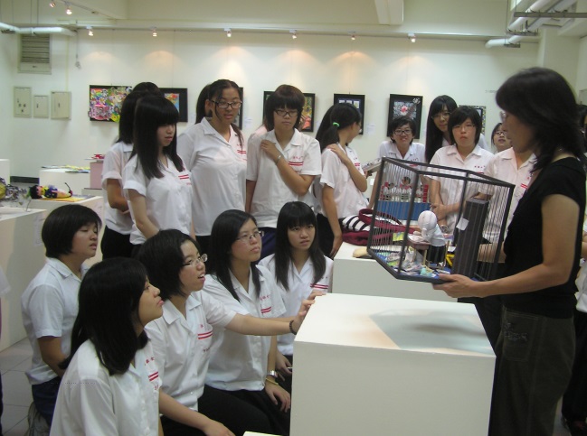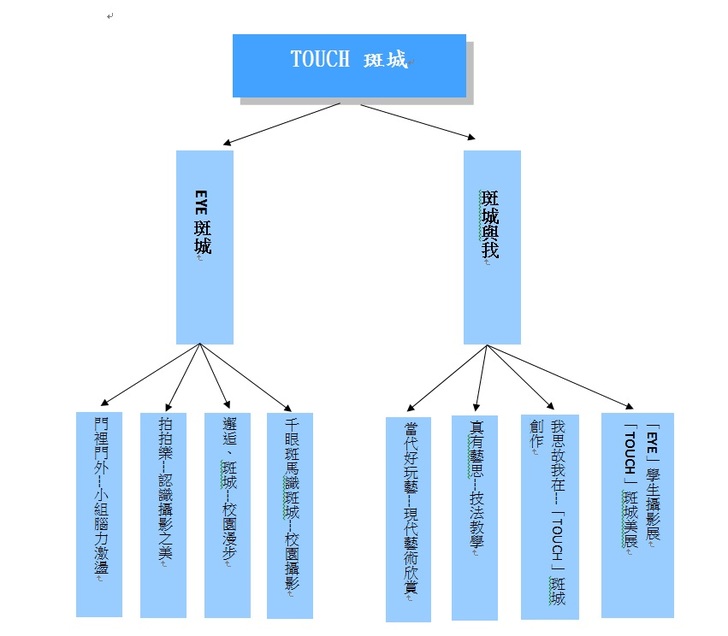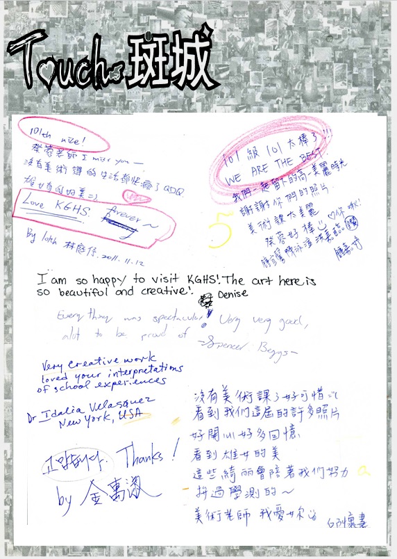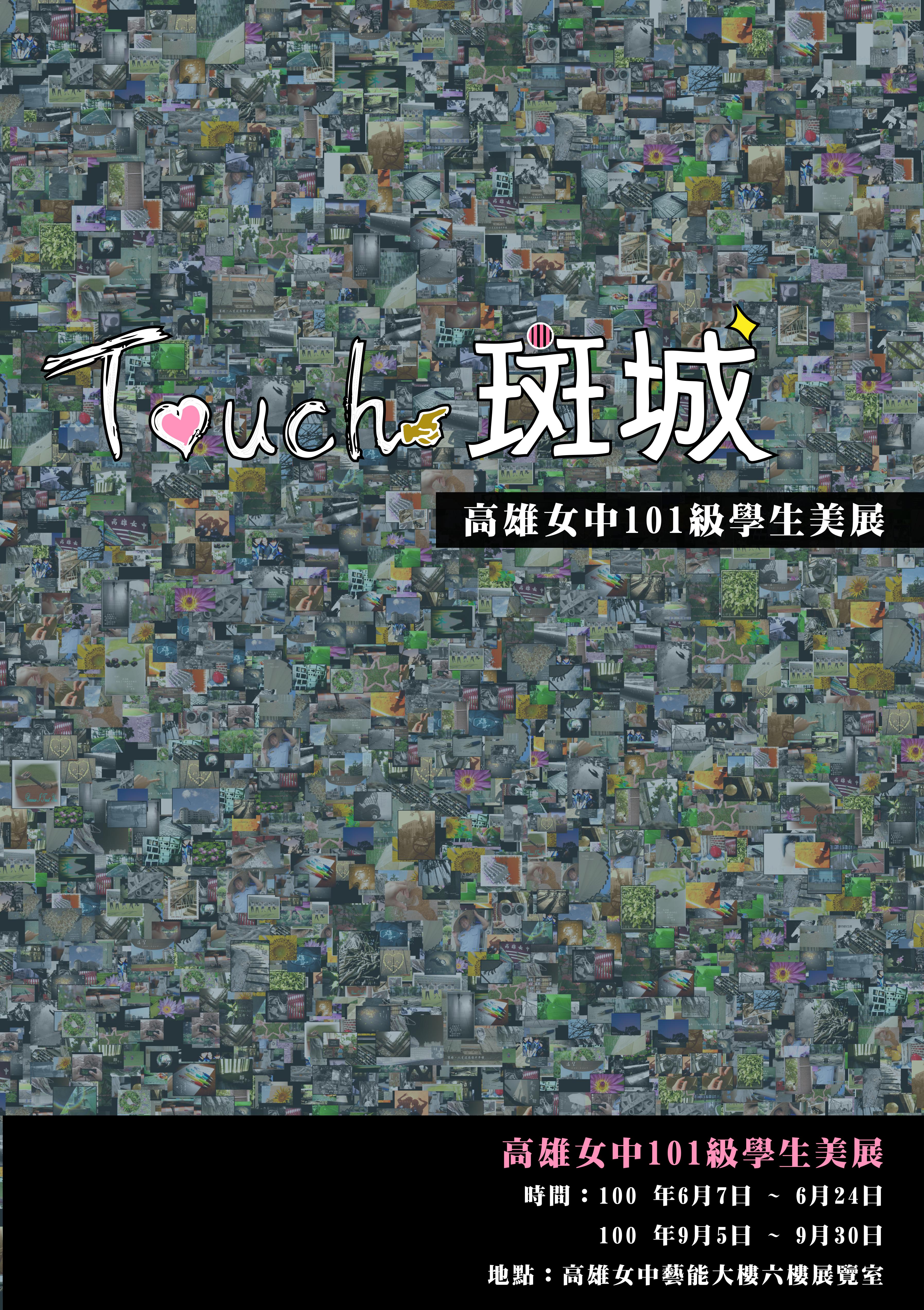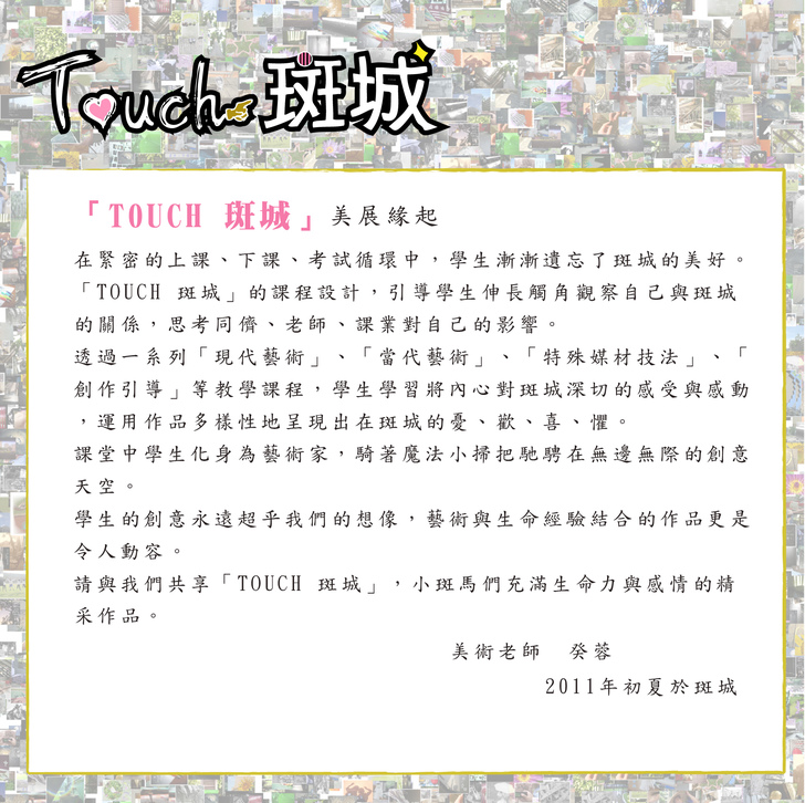 在雄女教學中細細觀察,學生在緊密的上課、下課、考試循環中,與學校的關係愈來愈淡泊,在學生認知裡學校只是傳授知識的地方,學生漸漸遺忘了學校的美好。 「TOUCH 斑城」的課程設計,以「TOUCH」為課程概念主軸,希望學生不只表象「接觸」學校,因著課程可以更深入觀察她與學校的關係,體察在斑城生活內心「觸動」的感受,對學校能產生更深且密切的認同感。 首先透過一系列攝影教學課程,希望學生以獨特的眼力,看到被忽略的校園角落。 雕塑大師羅丹:「我們的眼不是缺少美,而是缺少發現」 她們學習用不同角度尋找斑城之美,運用影像紀錄自己在斑城青澀歲月的快樂與憂愁。期許美術課能喚醒學生敏銳的眼、重拾被遺忘細膩的心。 接下來的課程引導學生伸長觸角觀察自己與斑城的關係,思考同儕、老師、課業等對自己的影響。再透過一系列「現代藝術」、「當代藝術」、「技法媒材教學」、「創作引導」等課程,學生學習將內心對斑城深切的感受與感動,運用現代藝術多元性的創作手法,呈現出在斑城的憂、歡、喜、懼。 創作的課程引導學生化身為藝術家,學習將藝術與生命經驗結合,用藝術抒發情感,創作時學生如魔法師般騎著魔法小掃把馳騁在無邊無際的創意天空,享受創作的快樂。 整體課程讓學生發現她們不只「TOUCH 斑城」、「EYE 斑城」,更「愛 斑城」。