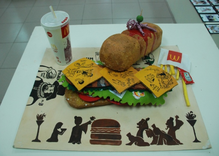 第一層麵包上刺著一個人,表達的是像祭品一樣的我們獻出自己。