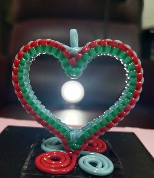 文章畫面心形膠管的編法,我用三種顏色的膠管編成。底部是在中空的膠管內插入鋁線再折成圓曲線,以便支撐站立心形圖案。