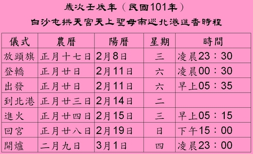 白沙屯拱天宮天上聖母壬辰年南巡北港進香時程