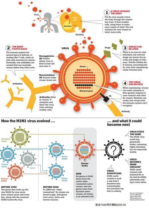 病毒以大量複製方式,很快就大量繁殖。連病毒的外套,都是借了宿主的細胞外套來用。 因此宿主很難應付,只有能對付 H 及 N 抗體的免疫力才會有效。其它身体的防衛反應,例如:細胞素 (cytokines) ,反而會誤傷宿主。