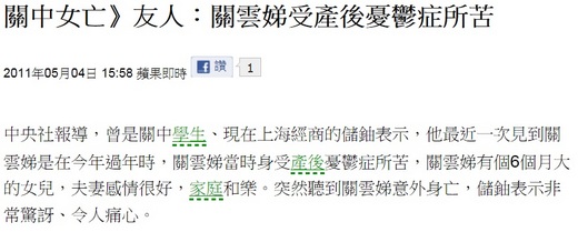 在三月的第一個長假後的週末,中部竟有一位重度產後憂鬱的母親,毒死三個子女自己也自焚的人倫悲劇,這是所有在精神及情緒方面疾病最可怕的後果,也代表了防治上的失敗,整個社會應該嚴正看待,並徹底的來檢討如何防止類似事件的再發生