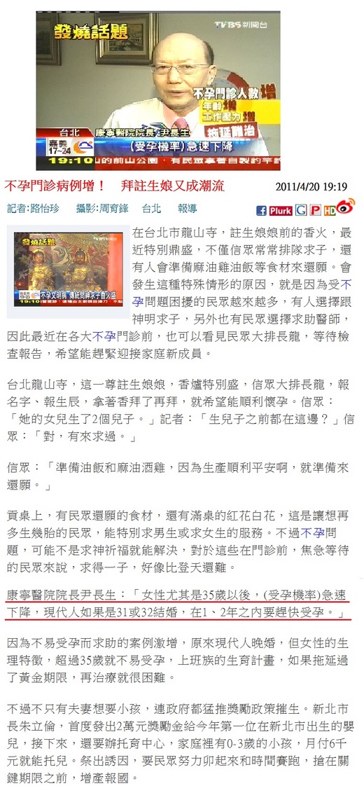 2011/4/20 TVBS NEWS 不孕症病例增,拜註生娘又成潮流!