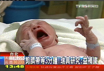 新生兒出生,醫師第一個動作,就是剪臍帶,不過瑞典一項最新研究建議,醫師不要急著剪臍帶,最好等3分鐘左右再剪,這樣可以增加寶寶體內的鐵質,而且晚剪臍帶不會造成新生兒黃疸,或是其他不利健康的影響,不過國內部份醫師認為,這對早產、體重不足的新生兒比較有幫助,至於體重足夠的新生兒則幫助有限。