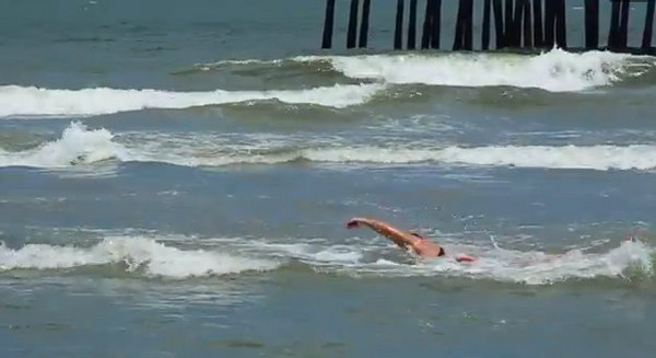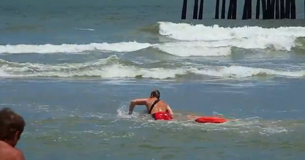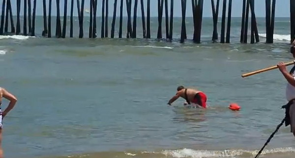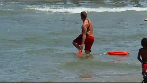 為甚麼到溪邊、海邊玩水,就算有救生員也要小心?國外遊客在海灘無意間拍到一名救生員背著魚雷浮標下水救人的過程,他在穿上蛙鞋以後大動作躍入水裡,使命划手、踢水前往疑似溺水者的所在位置,但游了半天竟然又站起來,原來根本還踩得到地!
