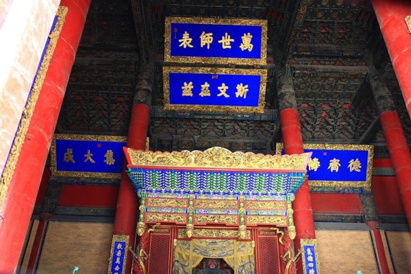 *圖3.今日山東曲阜孔廟大成殿,樑上的「萬世師表」也太新亮了,就是仿製品而已。其旁,清代皇帝頒賜眾匾也髹得太新,當然也是「西貝貨」。