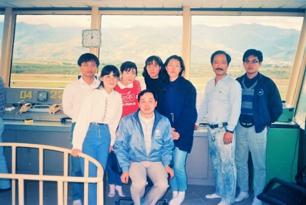 台東塔台首任台長蕭廣雄(右2)與同仁攝於旋轉樓梯口