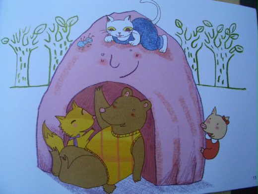 旁白︰這樣的遊戲實在太好玩了,大家忍不住請糖糖又變了好幾個,玩著玩著,大家都累了……最後大家全躺在糖糖的身上睡著了。