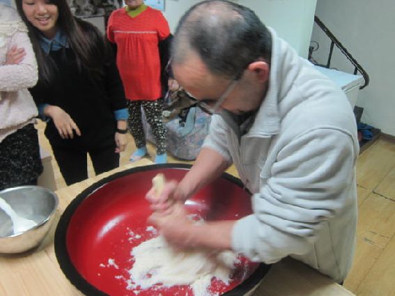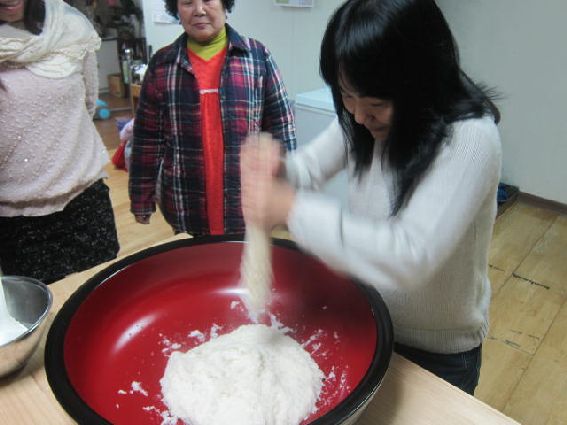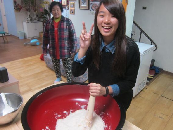 飯後的餘興節目是做麻糬〈年糕〉,美少姪女第一棒,要用力搗喔!