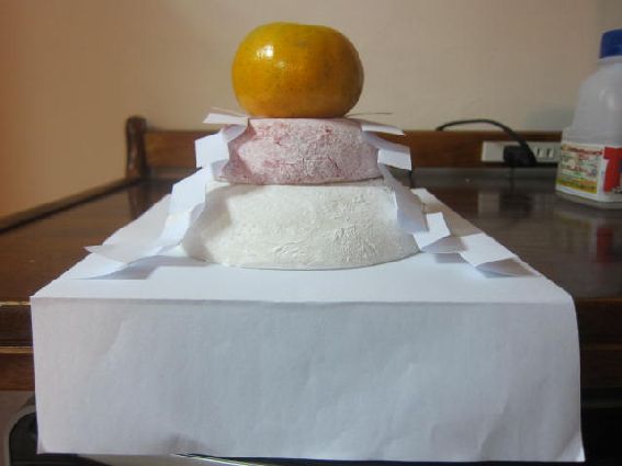 麻糬〈有年年高之意〉,這是沒有甜味的,不像台灣年糕是甜的,等放了幾天後可以切片跟著火鍋之類的雜菜煮一起煮,大家吃了有健康之意喔!因為這麻薯變得很硬,能有牙齒吃的下就表示身體很健康喔!也祝福大家新年身體健康、幸福滿溢!